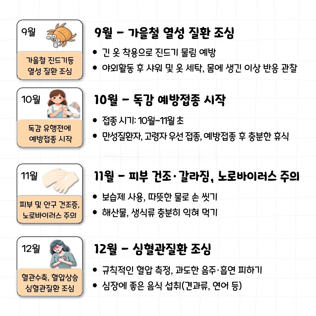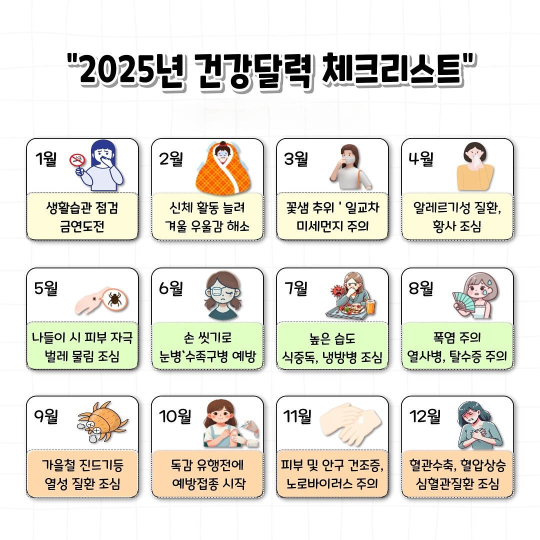 카테고리 없음 2025년 건강달력 체크리스 by 아웃풋언니 2025. 1. 4. 2025년 한해를 건강하게 보내고 싶다면!! 계절마다 달라지는 건강이슈를 알고 체크해 보는 습관을 가져봅시다~~ 2025년 건강달력 체크리스트 반응형 공유하기 게시글 관리 아웃풋언니 저작자표시 비영리 변경금지 (새창열림)